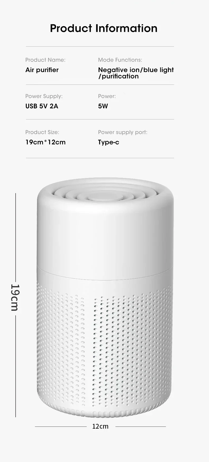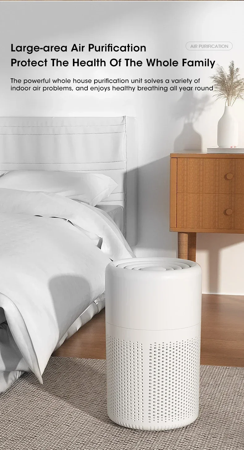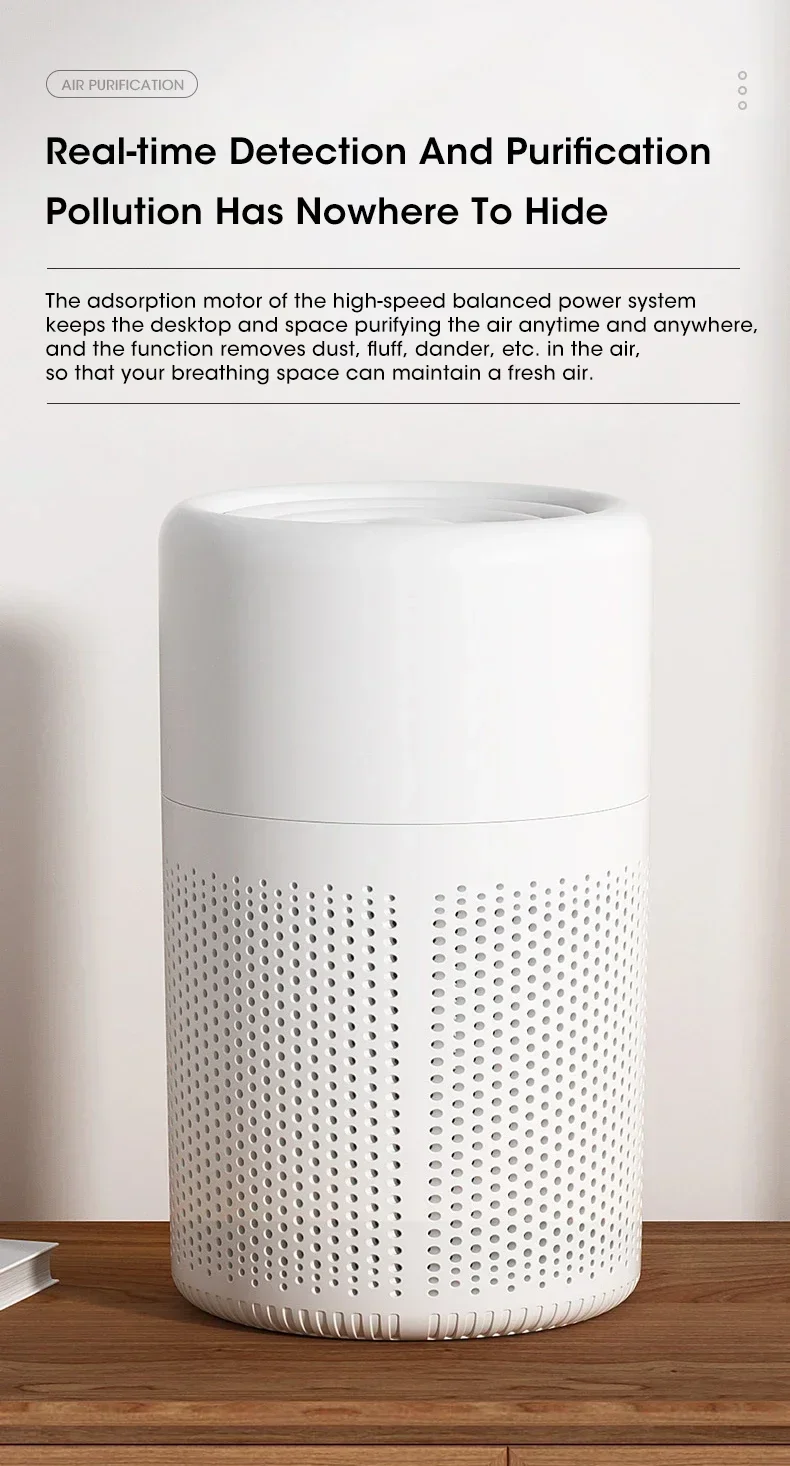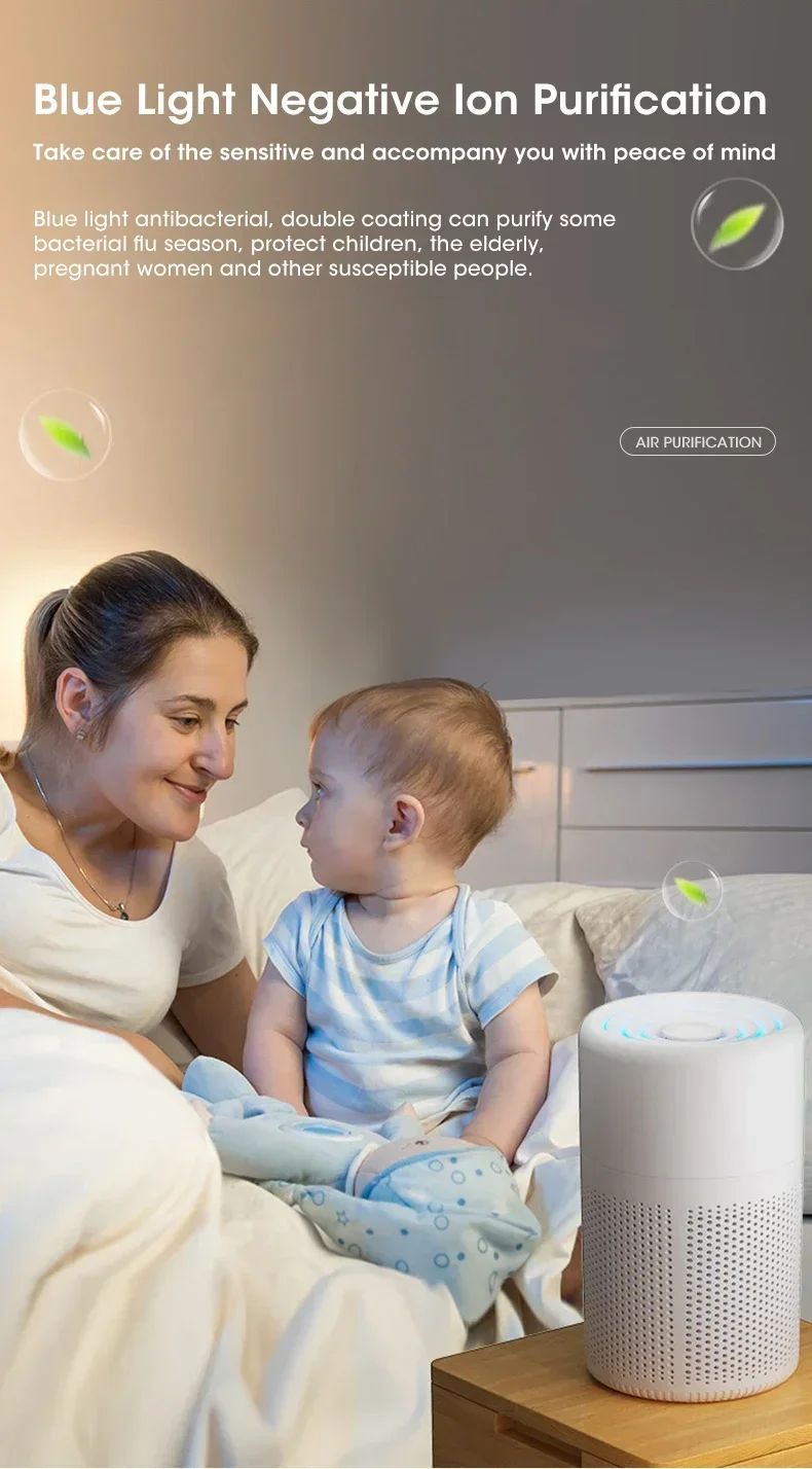 2.Negative ion purification function: After the air purifier is plugged in, it ionizes the air and generates negative ions, which carry negative charges. Most of the dust bacteria in the air have positive charges. After the negative ions undergo a neutralization reaction with these dust bacteria, they attach and settle, falling to the ground. At the same time, the negative ions use their own bactericidal and disinfection effect to remove bacteria from the air, thus making the air clean;